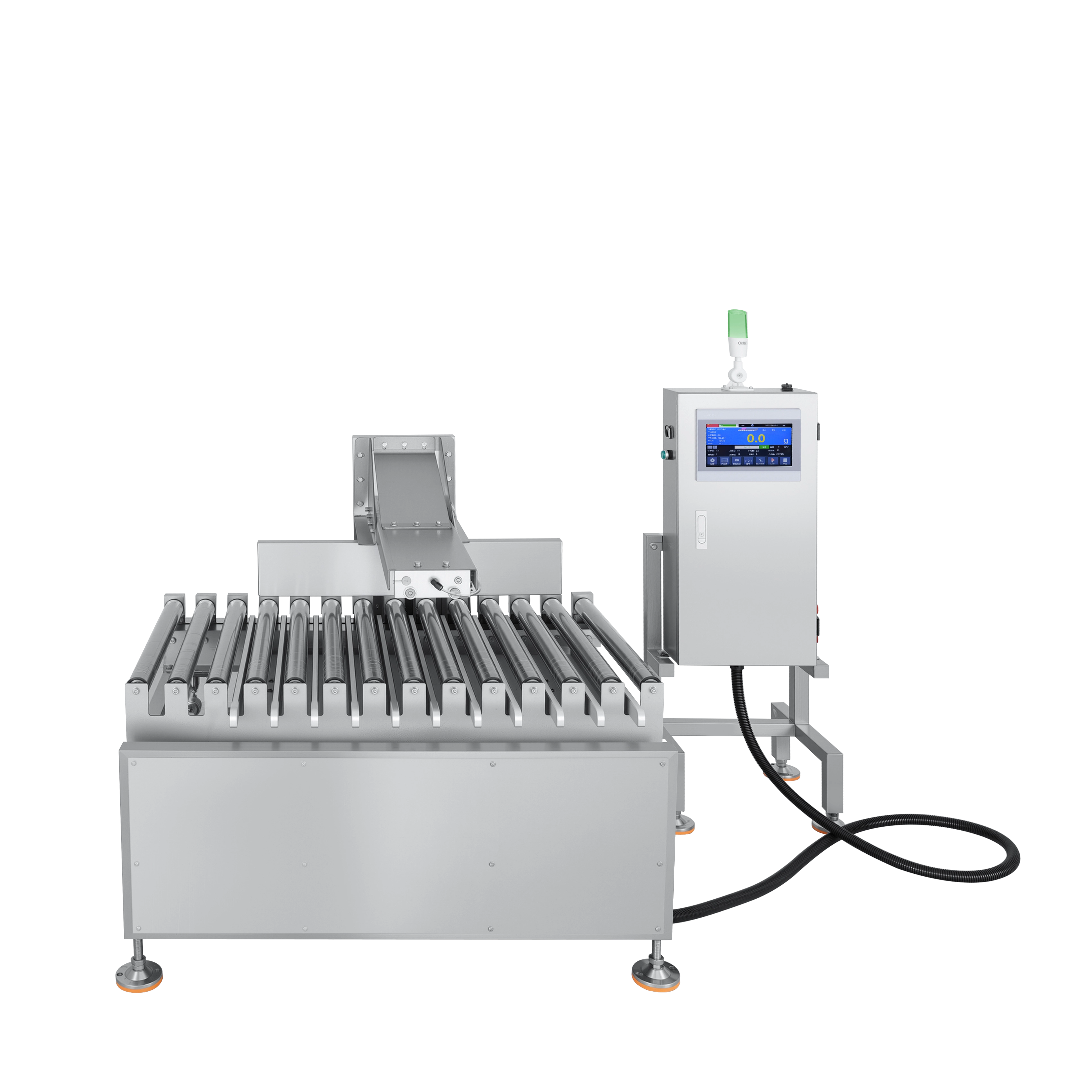 Роликовая секция взвешивания сочетается с бесштоковым цилиндром отбраковки, что экономит место для установки. И это подходит для тяжелых продуктов.